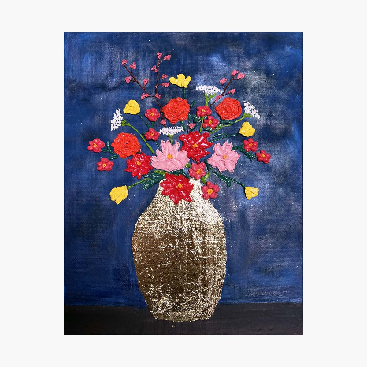 Dit lieve schilderij mag naar zijn forever home. Een mooi gouden vaasje met bloemen. Leuk voor in de woonkamer of keuken.